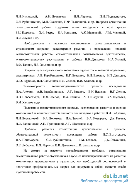 П.И. Пидкасистого, С.Л. Рубинштейна, М.Н. Скаткина, Н.Ф. Талызиной, и др. Вопросы организации самостоятельной работы студентов также находились в поле зрения Б.Ц. Бадмаева, Э.Ф. Зеера, Е.А. Климова, А.К. Марковой, Л.М. Митиной, В.Я. Ляудис и др.