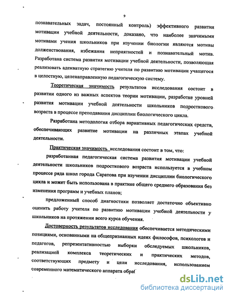 познавательных задач, постоянный контроль) эффективного развития мотивации учебной деятельности, доказано, что наиболее значимыми мотивами учения школьников при изучении биологии являются мотивы долженствования, избежания неприятностей и познавательный мотив. Разработана система развития мотивации учебной деятельности, позволяющая реализовать адекватную стратегию учителя по развитию мотивации учащегося в целостную, целенаправленную педагогическую систему.