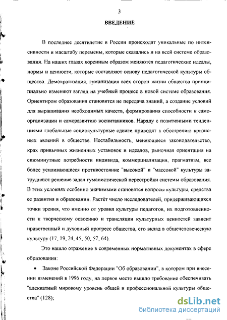 В последнее десятилетие в России происходят уникальные по интенсивности и масштабу перемены, которые сказались и на всей системе образования. На наших глазах коренным образом меняются педагогические идеалы, нормы и ценности, которые составляют основу педагогической культуры общества. Демократизация, гуманизация всех сторон жизни общества принципиально изменяют взгляд на учебный процесс в новой системе образования. Ориентиром образования становится не передача знаний, а создание условий для выращивания необходимых качеств, формирования способности к самоорганизации и саморазвитию воспитанников. Наряду с позитивными тенденциями глобальные социокультурные сдвиги приводят к обострению кризисных явлений в обществе. Нестабильность, меняющееся законодательство, крах привычных жизненных установок и идеалов, рыночная ориентация на сиюминутные потребности индивида, коммерциализация, прагматизм, все более усиливающиеся противостояние "высокой" и "массовой" культуры затрудняют решение задач гуманистической перестройки системы образования. В этих условиях особенно значимыми становятся вопросы культуры, средства ее развития в образовании. Растёт число исследователей, придерживающихся точки зрения, что именно от уровня культуры педагогов, их подготовленности к творческому освоению и трансляции культурных ценностей зависит нравственный и духовный прогресс общества, его вклад в общечеловеческую культуру (17, 19, 24, 45, 50, 57, 64).