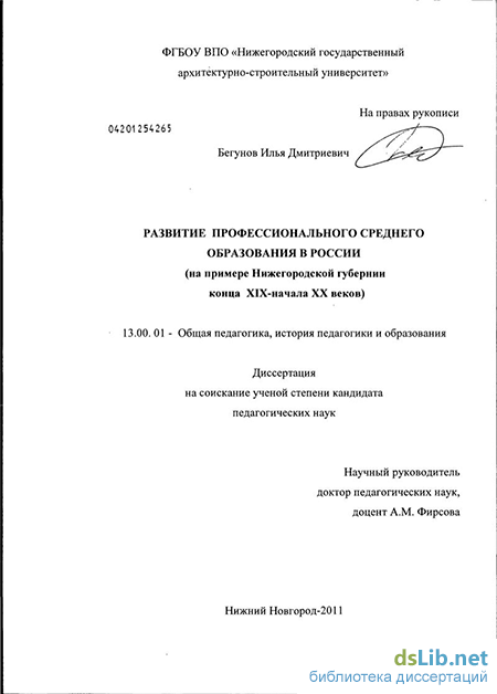 Степень изученности проблемы. В отечественной историко-педагогической литературе освещены отдельные вопросы становления начального (низшего) профессионального образования в общей системе дореволюционного просвещения. Краткие обзоры развития начального, в основном ремесленного образования, даны в специальных исследованиях по истории профессионально-технического образования в России (С. Я. Батышев, А. Н. Веселов, Э. Д. Днепров, Н. Н. Кузьмин, Е. Г. Осовский, А. И. Пискунов и др.). В работах по истории рабочего класса, интеллигенции, проблемам развития промышленности и техники (С. С. Дмитриев, Э. Э. Крузе, В. В. Лейкина-Свирская, А. Г. Рашин) вопросы профессиональной подготовки прослеживаются слабо.
