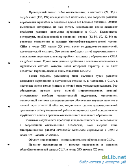 Проведенный анализ работ отечественных, в частности (27, 35) и зарубежных (136, 197) исследователей показывает, что вопросам развития образования придается в последнее время все большее значение. Однако имеющиеся материалы, на наш взгляд, недостаточно полно освещают проблемы развития школьного образования в США. Большинство литературы, опубликованной в советский период (32-34, 50, 82-84) по вопросам становления и развития философско-педагогической теории США в конце XIX начале XX века, носит тенденциозно-критический, идеологический характер. Это делает необходимым её переосмысление и поиск новых подходов к анализу проблем школьного образования в США на рубеже веков. Кроме того, данные проблемы в основном освещаются в журнальных статьях, которые носят обзорный характер и не дают целостной картины, освещая лишь отдельные аспекты.