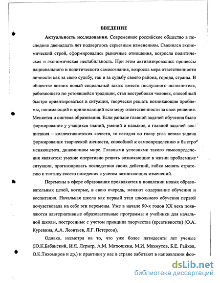 Перемены в сфере образования проявляются в появлении новых образовательных целей, которые, в свою очередь, меняют содержание обучения и воспитания. Начальная школа как первый этап школьного обучения первой почувствовала на себе эти перемены. Уже в начале 90-х годов XX века появляются альтернативные образовательные программы и учебники для начальной школы, построенные с учетом принципа творчества (креативности) (O.A. Куревина, A.A. Леонтьев, Л.Г. Петерсон).
