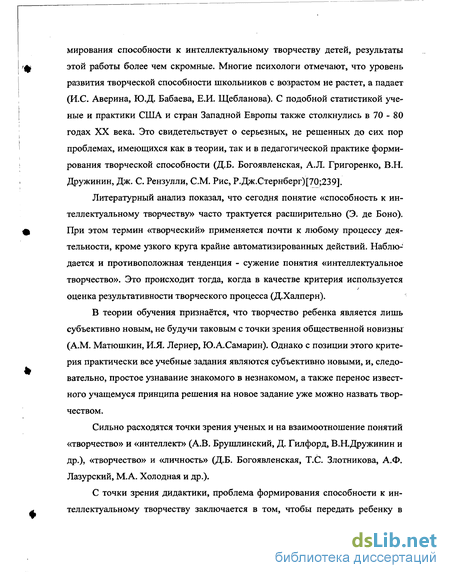 Однако, несмотря на то, что уже более пятидесяти лет ученые (Ю.К.Бабанский, И.Я. Лернер, A.M. Матюшкин, М.И. Махмутов, Б.Е. Райков, О.К.Тихомиров и др.) и практики у нас в стране работают в направлении формирования способности к интеллектуальному творчеству детей, результаты этой работы более чем скромные. Многие психологи отмечают, что уровень развития творческой способности школьников с возрастом не растет, а падает (И.С. Аверина, Ю.Д. Бабаева, Е.И. Щебланова). С подобной статистикой ученые и практики США и стран Западной Европы также столкнулись в 70 - 80 годах XX века. Это свидетельствует о серьезных, не решенных до сих пор проблемах, имеющихся как в теории, так и в педагогической практике формирования творческой способности (Д.Б. Богоявленская, A.JI. Григоренко, В.Н. Дружинин, Дж. С. Рензулли, С.М. Рис, Р.Дж.Стернберг)[70;239].
