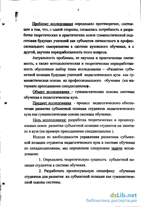 Предмет исследования - процесс педагогического обеспечения развития субъектной позиции студентов педагогического вуза как гуманистическая основа системы обучения.