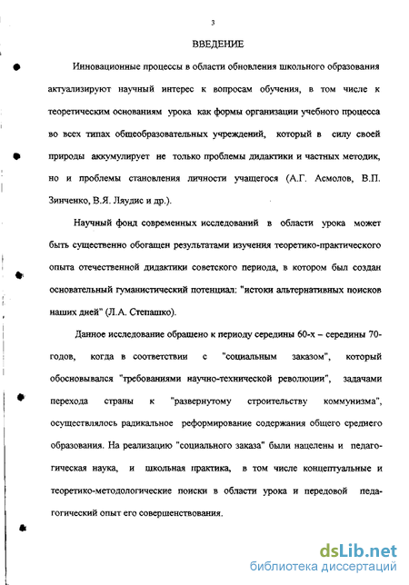 Данное исследование обращено к периоду середины 60-х - середины 70-годов, когда в соответствии с "социальным заказом", который обосновывался "требованиями научно-технической революции", задачами перехода страны к "развернутому строительству коммунизма", осуществлялось радикальное реформирование содержания общего среднего образования. На реализацию "социального заказа" были нацелены и педагогическая наука, и школьная практика, в том числе концептуальные и теоретико-методологические поиски в области урока и передовой педагогический опыт его совершенствования.