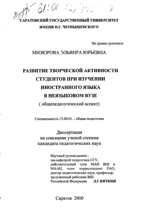 Тема исследования - "Развитие творческой активности студентов при изучении иностранного языка в неязыковом вузе". Работа выполнена в соответствии с тематикой научных исследований кафедры педагогики