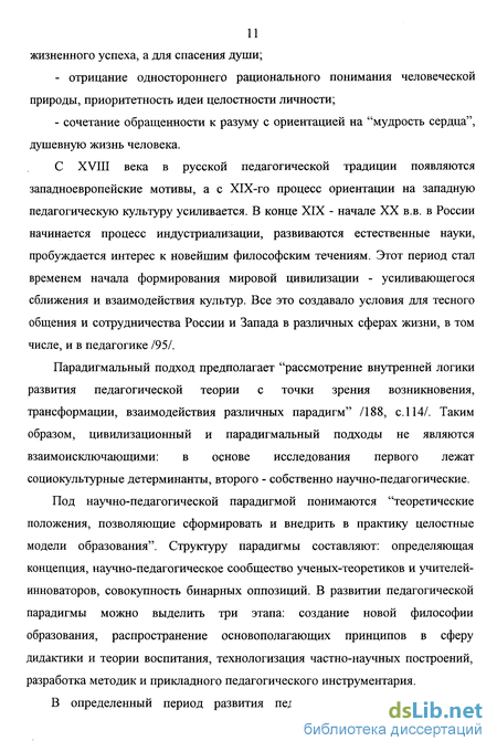 Парадигмальный подход предполагает "рассмотрение внутренней логики развития педагогической теории с точки зрения возникновения, трансформации, взаимодействия различных парадигм" /188, с. 114/. Таким образом, цивилизационный и парадигмальный подходы не являются взаимоисключающими: в основе исследования первого лежат социокультурные детерминанты, второго - собственно научно-педагогические.
