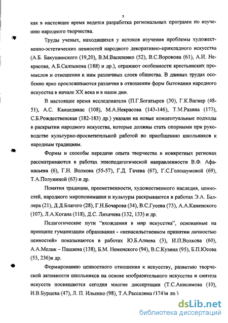 Большой вклад в разработку проблемы преподавания народного искусства в школе и воспитания на национальных традициях внесли ученые-педагоги Б.В.Нешумов (152), М.Ю.Новицкая (148,149), Г.А.Поровская (165), В.Г.Смирнов (197), Т.Я. Шпикалова (231-234), А.С.Хворостов (221) и др. В последние годы в диссертационных работах подчеркивается необходимость более широкого использования средств народного искусства как фактора духовно-нравственного воспитания школьников (Г.С. Голошумова (69), А.Я. Горош-ко (71), Е.С. Лыкова (134), С.Н. Новиков (147) и др.)