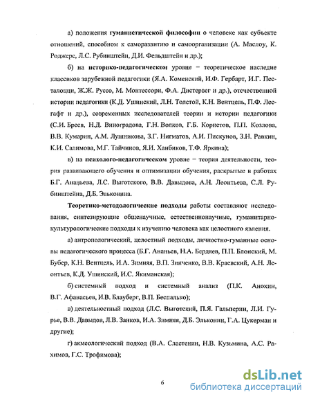б) на историко-псдагогнческом уровне - теоретическое наследие классиков зарубежной педагогики (Я.А. Коменский, И.Ф. Гербарт, И.Г. Пес талоцци, Ж.Ж. Руссо, М. Монтессори, Ф.А. Дистервег и др.), отечественной истории педагогики (К.Д. Ушинский, Л.Н. Толстой, К.Н. Вентцель, П.Ф. Лес гафт и др.), современных исследователей теории и истории педагогики (СИ. Бреев, Н.Д. Виноградова, Т.Н. Волков, Г.Б. Корнетов, П.П. Козлова, В.В. Кумарин, A.M. Лушникова, З.Г. Нигматов, А.И. Пискунов, З.Н. Равкин, К.И. Салимова, М.Г. Тайчинов, Я.И. Ханбиков, Т.Ф. Яркина);