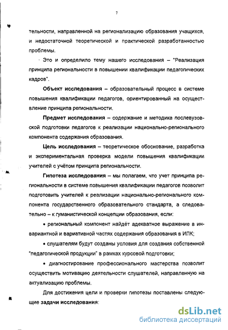 Гипотеза исследования - мы полагаем, что учет принципа региональности в системе повышения квалификации педагогов позволит подготовить учителей к реализации национально-регионального компонента государственного образовательного стандарта, а следовательно - к гуманистической концепции образования, если: региональный компонент найдёт адекватное выражение в инвариантной и вариативной частях содержания образования в ИПК; слушателям будут созданы условия для создания собственной "педагогической продукции" в рамках курсовой подготовки; диагностирование профессионального мастерства позволит осуществить мотивацию деятельности слушателей, направленную на актуализацию проблемы.