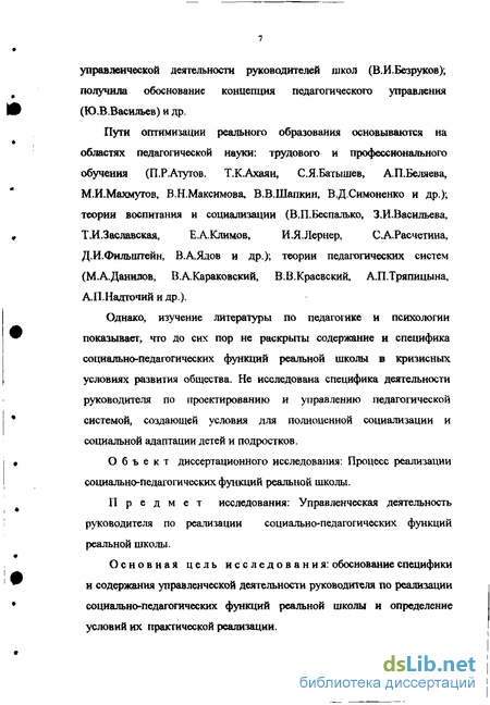 Актуальной задачей становится изучение деятельности руководителя по созданию и управлению такой педагогической системой, которая охватывала бы (моделировала) все звенья процесса социализации и социальной адаптации детей и подростков. Исходя из этого, была выбрана тема диссертационного исследования: "Реализация социально-педагогических функций реальной школы: управленческий аспект".
