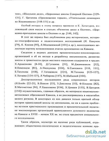 Диссертационные исследования ряда современных авторов (Н.Блейх [22-25], В.Власов [33], З.Джелиева [53], Ф.Кокаева [82], В.Магометова [94], Р.Хашхожева [156], Х.Цомаев [153], В.Цатуров [154]) осуществлялись, главным образом, на материале национально-автономных образований Кавказа, а не рассматривались в масштабах целого региона. В некоторых из них давался только краткий обзор истории православной школы по автономиям, но ни в одном проблема истоков христианского просвещения и просветительской политики миссионерских организаций православного духовного ведомства на Кавказе в XVIII - начале XX вв. не стала предметом специального исследования.