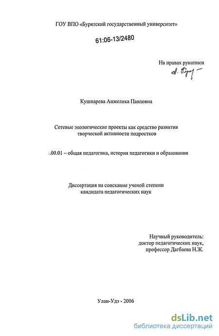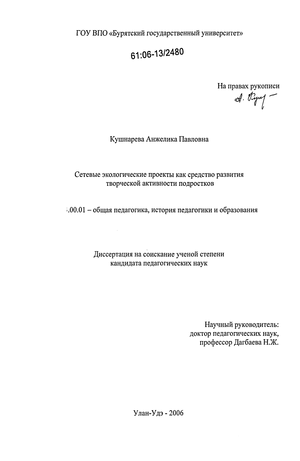непосредственную педагогическую деятельность диссертанта в качестве педагога-локального организатора и координатора сетевых экологических проектов в музыкально-гуманитарном лицее им. Д. Аюшеева;