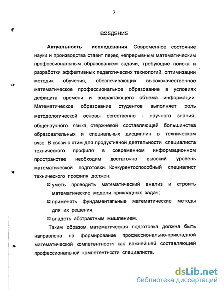 Актуальность исследования. Современное состояние науки и производства ставит перед непрерывным математическим профессиональным образованием задачи, требующие поиска и разработки эффективных педагогических технологий, оптимизации методик обучения, обеспечивающих высококачественное математическое профессиональное образование в условиях дефицита времени и возрастающего объема информации. Математическое образование студентов выполняет роль методологической основы естественно - научного знания, общенаучного языка, стержневой составляющей большинства образовательных и специальных дисциплин в техническом вузе. В связи с этим для продуктивной деятельности специалиста технического профиля в современном информационном пространстве необходим достаточно высокий уровень математической подготовки. Конкурентоспособный специалист технического профиля должен: и уметь проводить математический анализ и строить математические модели прикладных задач; и применять фундаментальные математические методы для их решения; и владеть абстрактным мышлением.