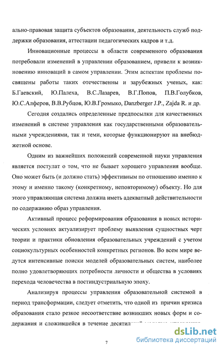 Инновационные процессы в области современного образования потребовали изменений в управлении образованием, привели к возникновению инноваций в самом управлении. Этим аспектам проблемы посвящены работы таких отечественны и зарубежных ученых, как: Б.Гаевский, Ю.Палеха, В.С.Лазарев, В.Г.Попов, П.В.Голубков, Ю.С.Алферов, В.В.Рубцов, Ю.В.Громыко, Danzberger J.P., Zajda R. и др.