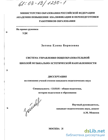 Данное диссертационное исследование посвящено разработке и обоснованию эффективной системы управления общеобразовательной школой с музыкально-эстетической направленностью образования учащихся.