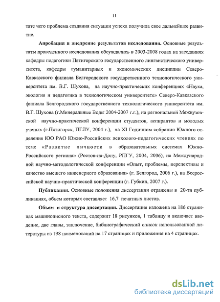 Апробация и внедрение результатов исследования. Основные результаты проведенного исследования обсуждались в 2003-2008 годах на заседаниях кафедры педагогики Пятигорского государственного лингвистического университета, кафедры гуманитарных и экономических дисциплин Северо-Кавказского филиала Белгородского государственного технологического университета им. В.Г. Шухова, на научно-практических конференциях «Наука, экология и педагогика в технологическом университете» Северо-Кавказского филиала Белгородского государственного технологического университета им. В.Г. Шухова (г.Минеральные Воды 2004-2007 г.г.), на региональной Межвузовской научно-практической конференции студентов, аспирантов и молодых ученых (г.Пятигорск, ПГЛУ, 2004 г.), на XI Годичном собрании Южного отделения ЮО РАО Южно-Российских психолого-педагогических чтениях по теме «Развитие личности в образовательных системах Южно-Российского региона» (Ростов-на-Дону, РПГУ, 2004, 2006), на Международной научно-методологической конференции «Опыт, проблемы, перспективы и качество высшего инженерного образования» (г. Белгород, 2006 г.), на Всероссийской научно-практической конференции (г. Губкин, 2007 г.).