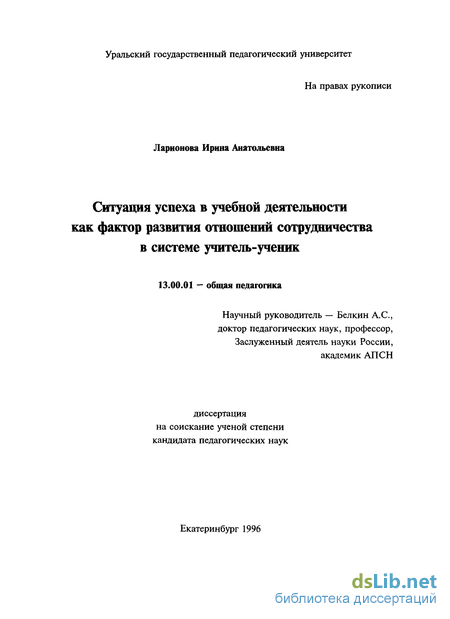 Таким образом, сложилось явное противоречие между необходимостью развития личности ребенка в системе отношений сотрудничества учителя и учащихся и отсутствием целостного теоретического обоснования становления данных отношений. В связи с изменившимися социокультурными условиями, переоценкой взглядов на назначение человека и выделенным противоречием обозначилась проблема поиска новых путей и средств развития педагогически целесообразных отношений в системе учитель-ученик. Нами проанализировано множество факторов, обеспечивающих интенсификацию процесса становления отношений сотрудничества (педагогическое требование, тщательное планирование всей деятельности школы, индивидуальный подход к учащимся, учет возрастных особенностей воспитанников и др.), однако чаще всего эти факторы даются ря-доположенно, без выделения доминанты и связываются ролью педагога, оставляя учащихся на позиции пассивных участников образовательного процесса, что противоречит природе сотрудничества. Мы полагаем, что существует еще один фактор, имеющий несомненное преимущество перед другими, т.к. позволяет преодолеть перечисленные выше недостатки. Этот фактор мы определили как "ситуация успеха", который активизирует не только деятельность учителя, но и самих учащихся.