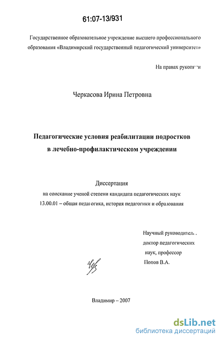 - Реабилитация подростков в лечебно-профилактическом учреждении как педагогическая проблема