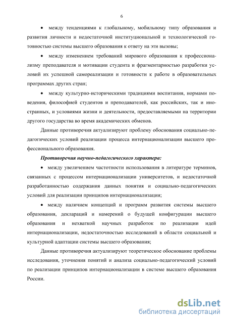 Е.Г. Леонтьева отмечает: «Человечество связывает надежду на преодоление кризиса культуры с возможностями образования как важнейшего социального института. На рубеже XX - XXI веков вопрос о статусе университетского образования и потенциальных возможностях не потерял своей актуальности. Важно сформировать модель образования, адекватную потребностям нового века, - ту модель, которая подготовит переход к новому типу социального развития и, по сути, придаст этому развитию новый импульс» [86, с. 2]. Противоречие сложившейся ситуации, по ее мнению, состоит в том, что классическая образовательная модель не вполне способна ответить на вызов современным требованиям, а идущие по пути коммерциализации университеты выхолащивают ценности высшего образования, в первую очередь, духовные. «Необходимы новые подходы к практике университетского образования, - подчеркивает Е.Г. Леонтьева, - ориентирован ные как на сущностные параметры, доминантные характеристики университетского образования, важнейшими из которых являются фундаментализация, гуманизация и экологизация образовательной системы, так и на интернационализацию университетского образования» [86, с. 21]. Автор в логике философского подхода связывает интернационализацию с широкой интеграцией в области организации образования и подготовки профессиональных кадров: «Под интернационализацией университетского образования мы понимаем процесс международной интеграции университетского образования, ориентированный на согласованность учебных программ университетов с целью обеспечения равноценности дипломов. Целью интернационализации университетского образования является подготовка студентов и специалистов к международному сотрудничеству и конкуренции, которые будут доминировать в новом тысячелетии во всех сферах жизнедеятельности общества» - пишет Е.Г.Леонтьева [86, с. 4].