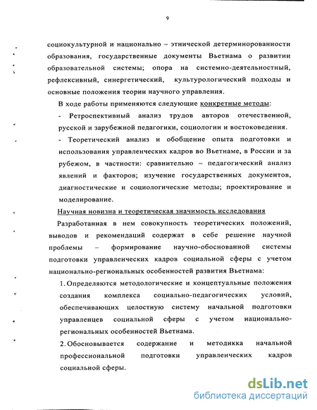 Научная новизна и теоретическая значимость исследования Разработанная в нем совокупность теоретических положений, выводов и рекомендаций содержат в себе решение научной проблемы - формирование научно-обоснованной системы подготовки управленческих кадров социальной сферы с учетом национально-региональных особенностей развития Вьетнама: