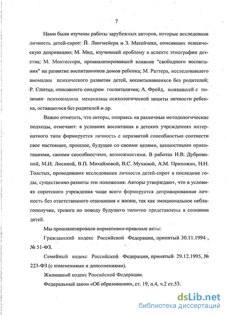 Нами были изучены работы зарубежных авторов, которые исследовали личность детей-сирот: И. Лангмейера; и; 3: Матейчека, описавших психическую депривацию; М; Мид, изучившей проблему в • аспекте этнографии детства;" М. Монтессори, проанализировавшей влияние "свободного воспитания" нафазвитие. воспитанников домов ребенка; М. Раттера, исследовавшего аномалии психического развития детей, воспитывавшихся? без родителей; -РгЄпитца; описавшего синдром; госпитализма;:А. Фрейд, выявившей позиции1 психоанализа механизмы психологической защиты личности ребенка, оставшегосябез родителей; и др.