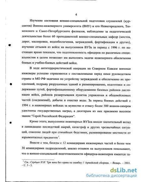 Анализ современной войсковой практики, опыта участия инженерных войск Министерства обороны Российской Федерации (далее - МО РФ) в боевых действиях в Чеченской Республике (1994-96 гг.), Дагестане (1999 г.), Чечне (с августа 1999 г. по настоящее время), других «горячих точках» показывает, что военно-специальная подготовленность офицерских кадров имеет особую важность. Её основы закладываются у курсантов и получают дальнейшее развитие у слушателей в процессе обучения и воспитания в высших военно-учебных заведениях инженерных войск (ВУЗах) МО РФ. Военно-специальная подготовка слушателей (курсантов) ВУЗов - это процесс овладения обучаемыми систематизированными знаниями, формирования навыков и умений выполнения задач инженерного обеспечения, мероприятий по фортификации, маскировке, инженерным заграждениям, взрывному делу, военным дорогам, мостам и переправам, водообеспечению, содержания инженерной техники и вооружения1.