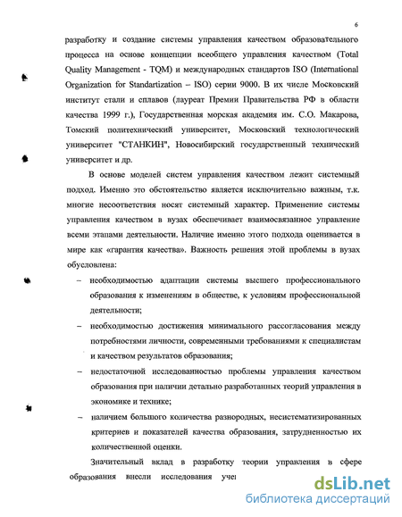 6 разработку и создание системы управления качеством образовательного процесса на основе концепции всеобщего управления качеством (Total Quality Management - TQM) и международных стандартов ISO (International Organization for Standartization - ISO) серии 9000. В их числе Московский институт стали и сплавов (лауреат Премии Правительства РФ в области качества 1999 г.), Государственная морская академия им. СО. Макарова, Томский политехнический университет, Московский технологический университет "СТАНКИН", Новосибирский государственный технический университет и др.