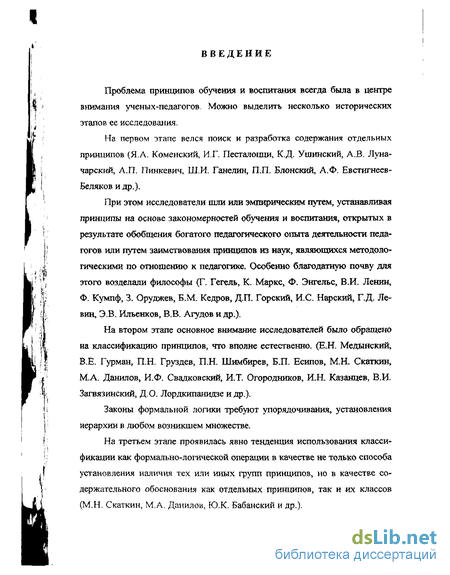 При этом исследователи шли или эмпирическим путем, устанавливая принципы на основе закономерностей обучения и воспитания, открытых в результате обобщения богатого педагогического опыта деятельности педагогов или путем заимствования принципов из наук, являющихся методологическими по отношению к педагогике. Особенно благодатную почву для этого возделали философы (Г. Гегель, К. Маркс, Ф. Энгельс, В.И. Ленин, Ф. Кумпф, 3. Оруджев, Б.М Кедров, ДЛ. Горский, И.С. Нарский, Г.Д- Левин, Э.В. Ильенков, В.В. Агудов и др.).
