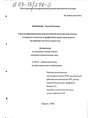 Вследствие этого научной задачей диссертации является выбор средств формирования педагогической культуры как основы готовности студентов к профессиональной деятельности.