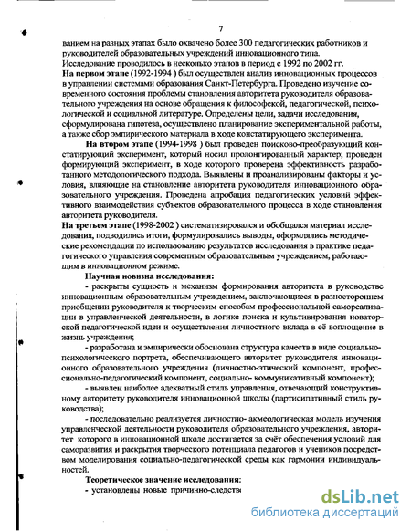 ванием на разных этапах было охвачено более 300 педагогических работников и руководителей образовательных учреждений инновационного типа. Исследование проводилось в несколько этапов в период с 1992 по 2002 гг. На первом этапе (1992-1994 ) был осуществлен анализ инновационных процессов в управлении системами образования Санкт-Петербурга. Проведено изучение современного состояния проблемы становления авторитета руководителя образовательного учреждения на основе обращения к философской, педагогической, психологической и социальной литературе. Определены цели, задачи исследования, сформулирована гипотеза, осуществлено планирование экспериментальной работы, а также сбор эмпирического материала в ходе констатирующего эксперимента.