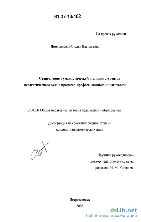 Дмитрякова, Н.В. Педагогические условия становления гуманистической позиции студентов вуза / Н.В. Дмитрякова // Гуманитарные и социально-экономические науки. Спецвыпуск Педагогика. -2006. - №5. - С. 33 - 42.