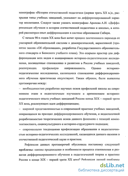 монографии «История отечественной педагогики (первая треть XX в.)», раскрывая типы учебных заведений, указывает на дифференцированный характер воспитания. Следует также указать монографию Арапова А.И. «Дифференциация обучения в истории отечественной педагогики и школы», в которой рассмотрен опыт дифференциации в системе образования Сибири.