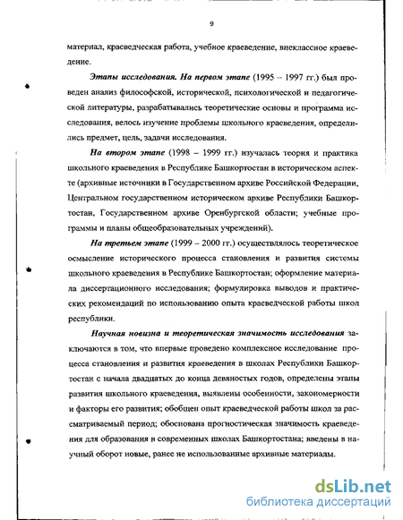 Этапы исследования. На первом этапе (1995 - 1997 гг.) был проведен анализ философской, исторической, психологической и педагогической литературы, разрабатывались теоретические основы и программа исследования, велось изучение проблемы школьного краеведения, определились предмет, цель, задачи исследования.