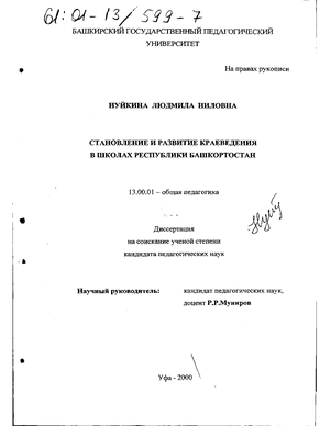 зовских и региональных научно-практических конференциях в гг. Туле (1996 г.), Чебоксарах (1996 г.), Уфе (1997, 1999 гг.), Казани (1999 г.), Стер-литамаке (2000 г.) и др.; на научно-практических конференциях Стерлитамакского государственного педагогического института, на заседаниях кафедры педагогики Стерлитамакского государственного педагогического института и кафедры научных основ управления школой Башкирского государственного педагогического университета. Результаты исследования используются в преподавании спецкурса по краеведению на технолого-экономическом факультете Стерлитамакского государственного педагогического института.