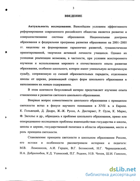 Актуальность исследования. Важнейшим условием эффективного реформирования современного российского общества является развитие и совершенствование системы образования. Национальная доктрина образования и федеральная программа развития образования на 2001-2005 гг. нацелены на формирование гармонично развитой, гуманистически ориентированной, творчески активной личности учащихся. Однако их успешная реализация возможна, в частности, при условии всестороннего изучения и использования мирового и отечественного опыта развития образования, особенно школьного, которое имеет уникальную историческую судьбу, сопряженную со сменой образовательных парадигм, отделением школы от церкви, реанимацией старых форм школьного образования и наполнением их новым содержанием.