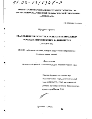 - Предпосылки становления и развития внешкольных детских учреждений в Таджикистане 1917-1930гг