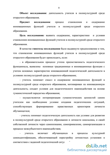 Предмет исследования: процесс становления и содержание инновационных функций учителя в поликультурной среде открытого образования.