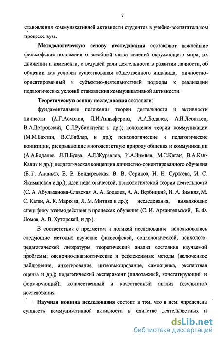 Методологическую основу исследования составляют важнейшие философские положения о всеобщей связи явлений окружающего мира, их движении и изменении, о ведущей роли деятельности в развитии личности, об общении как условии существования общественного индивида, личностно-ориентированный и субъектно-деятельностный подходы к реализации педагогических условий становления коммуникативной активности.