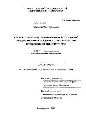 определена совокупность педагогических условий, обеспечивающих эффективность становления культуры психолого-педагогической аутодиагностики студента в образовательном процессе педагогического вуза: актуализация ценностного содержания культуры психолого-педагогической аутодиагностики студента педагогического вуза; модернизация межпредметной проектной деятельности студента в условиях диалога культур; сопровождение психолого-педагогической аутодиагностики студента в процессе его вхождения в инновационную педагогическую деятельность.
