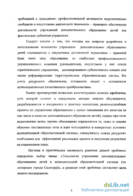Научная и практическая значимость решения данной проблемы определили выбор темы: «Технология управления дополнительным образованием детей в муниципальной образовательной системе (на материале города Салехард)», а решение этой проблемы составляет цель нашего исследования.