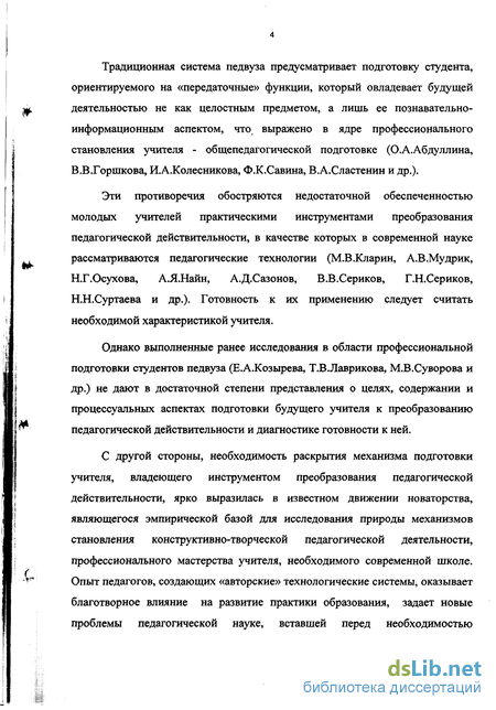 Однако выполненные ранее исследования в области профессиональной подготовки студентов педвуза (Е.А.Козырева, Т.В.Лаврикова, М.В.Суворова и др.) не дают в достаточной степени представления о целях, содержании и процессуальных аспектах подготовки будущего учителя к преобразованию педагогической действительности и диагностике готовности к ней.
