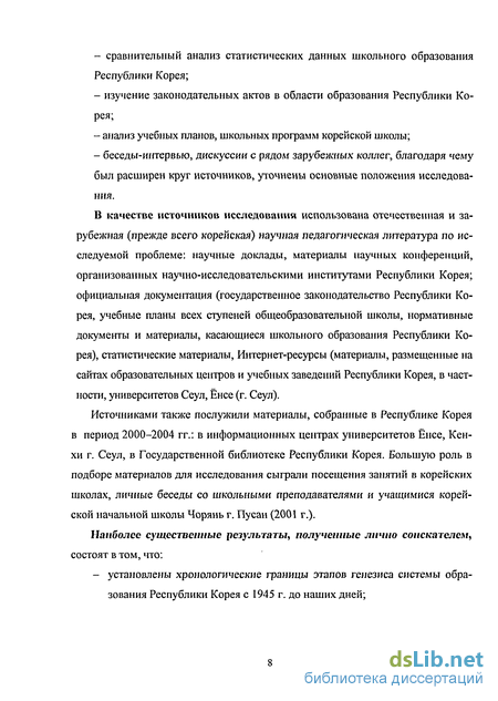 Работа написана с использованием историко-педагогического и сравнительного метода, при изучении трудов корейских и отечественных педагогов, российских и зарубежных кореистов, а также обобщающих трудов по различным проблемам мирового школьного образования.