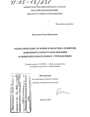 Названные и многие другие труды значительно обогатили представление об изучаемой проблеме. Однако очевидным является и то, что в настоящее время отсутствуют специальные исследования дополнительного образования в школе. Это послужило основанием для выбора темы диссертации «Теоретические основы и практика развития дополнительного образования в общеобразовательных учреждениях».