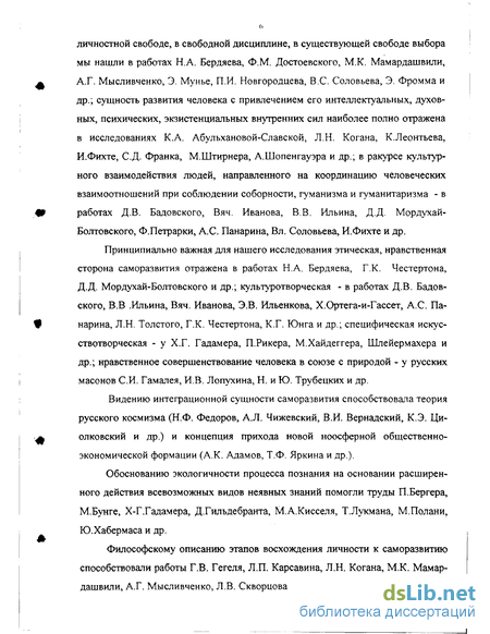 личностной свободе, в свободной дисциплине, в существующей свободе выбора мы нашли в работах Н.А. Бердяева, Ф.М. Достоевского, М.К. Мамардашвили, А.Г. Мысливченко, Э. Мунье, П.И. Новгородцева, B.C. Соловьева, Э. Фромма и др.; сущность развития человека с привлечением его интеллектуальных, духовных, психических, экзистенциальных внутренних сил наиболее полно отражена в исследованиях К.А. Абульхановой-Славской, Л.Н. Когана, К.Леонтьева, И.Фихте, С.Д. Франка, М.Штирнера, А.Шопенгауэра и др.; в ракурсе культурного взаимодействия людей, направленного на координацию человеческих взаимоотношений при соблюдении соборности, гуманизма и гуманитаризма - в работах Д.В. Бадовского, Вяч. Иванова, В.В. Ильина, Д.Д. Мордухай-Болтовского, Ф.Петрарки, А.С. Панарина, Вл. Соловьева, И.Фихте и др.
