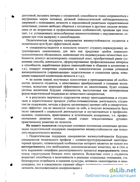 Совершенными педагогическими исследованиями, дающими материалы для создания модели педагогической поддержки саморазвития жизнеустойчивости студентов в техническом вузе, стали те, в которых рассматриваются проблемы педагогики самоопределения (Н.В. Рыбалкина), взаимосвязи науки и практики в процессе подготовки специалистов (В.А. Бордовский, Ю.В. Варданян), преемственности между уровнями образования, культуротворчества и высокой корпоративности выпускников университета (М.Н. Невзоров, Л.Н. Степашко), гражданственности воспитания (A.M. Столяренко), интеллигентности и высокой духовности университетской жизни независимо от политического строя и экономических условий в стране (Б.В. Тарасов, В.А. Беляева).