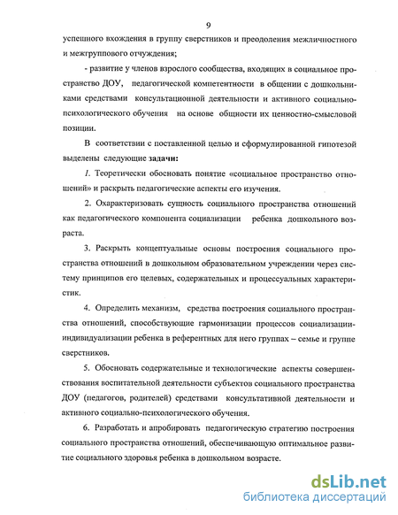 Гипотеза исследования. Представление о социальном пространстве отношений как системе социально-ролевых и межличностных отношений, реализующихся в условиях определенного социального института, как факторе интеграции воспитательных возможностей основных социальных институтов позволяет выделить его как педагогический компонент социализации ребенка на этапе дошкольного детства и осмыслить как педагогическую категорию.