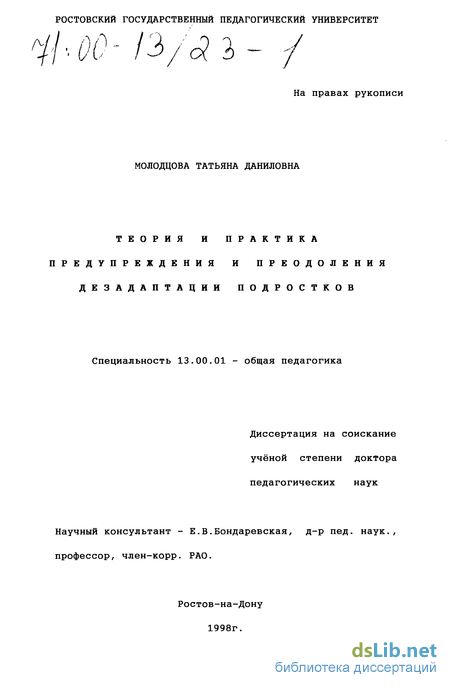 ке основ целостной теории преодоления дезадаптации, в проведении ис-торико-педагогического анализа предупреждения дезадаптации в теории и практике: рассмотрении дезадаптации как многовидового явления и авторская классификация её видов, подвидов, типов, уровней; выявлении психологических механизмов дезадаптации, их систематизации; рассмотрении возрастных особенностей подростков, с точки зрения их предрасположенности к дезадаптации; раскрытии специфики подготовки будущих социальных педагогов к работе по предупреждению и преодолению дезадаптации подростков; создании, с учётом всех выявленных факторов, закономерностей, механизмов, теоретической модели предупреждения и преодоления дезадаптации подростков.