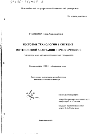 Предмет исследования: пути интенсификации процесса адаптации первокурсников к обучению в вузе при использования тестовых технологий и специальных организующих средств (на примере курса математики технического университета).
