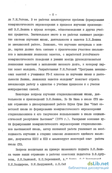 - 8 -ла Р.М.Рогова. В ее работах анализируются проблемы формирования коммунистического мировоззрения в процессе изучения произведений В.И.Ленина в курсах истории, обществоведения и других учебных предметов. Значительное место в ее работах занимает раскрытие системы изучения жизни, деятельности и заветов В.И.Ленина во внеклассной работе. Показано, что изучение материала о вожде, партии должно быть связано с практическим участием школьников в выполнении ленинских заветов, с выработкой устойчивого коммунистического поведения и умения всегда руководствоваться ленинскими заветами в выполнении высокого долга, к которому партия зовет молодежь. Разработанная Р.М.Роговой "Программа внеклассных занятий с учащимися УШ-Х классов по изучению жизни и деятельности Ленина, ленинских заветов молодежи" помогает строить внеклассную работу в единстве с учебным процессом и с учетом межпредметных связей.